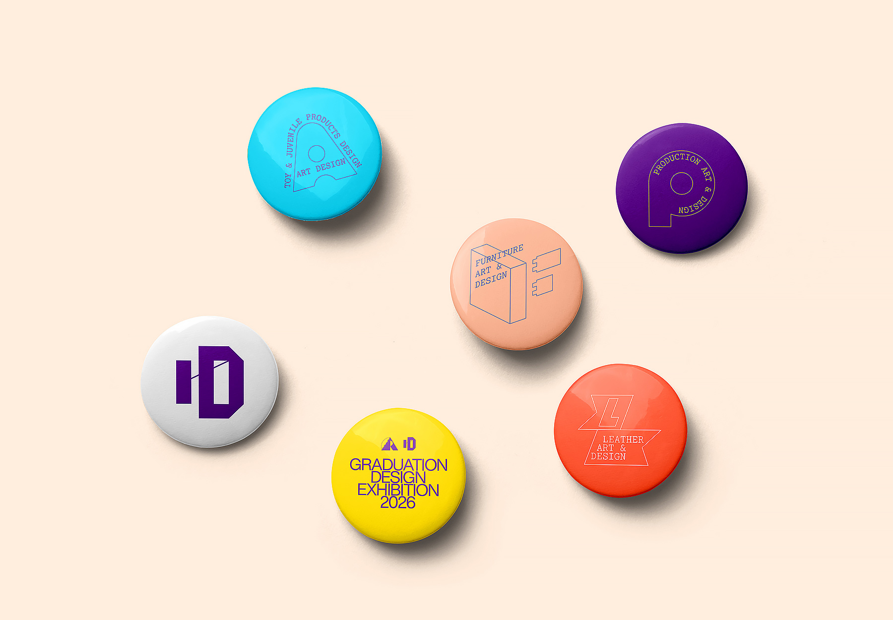 为丰富画面的视觉层次并增强细节表现力,我们设计了整套专业图标系统。图标设计以基本的设计构成元素为原点,结合各专业名称的符号化表达,同时将工业设计学院的品牌符号——斜线——贯穿其中,使每一个图标既具备独立识别性,又承载着学院整体的品质感与专业性。这些图标在展板、导览、证件、数字媒体等场景中反复出现,成为串联整体视觉的隐性线索。