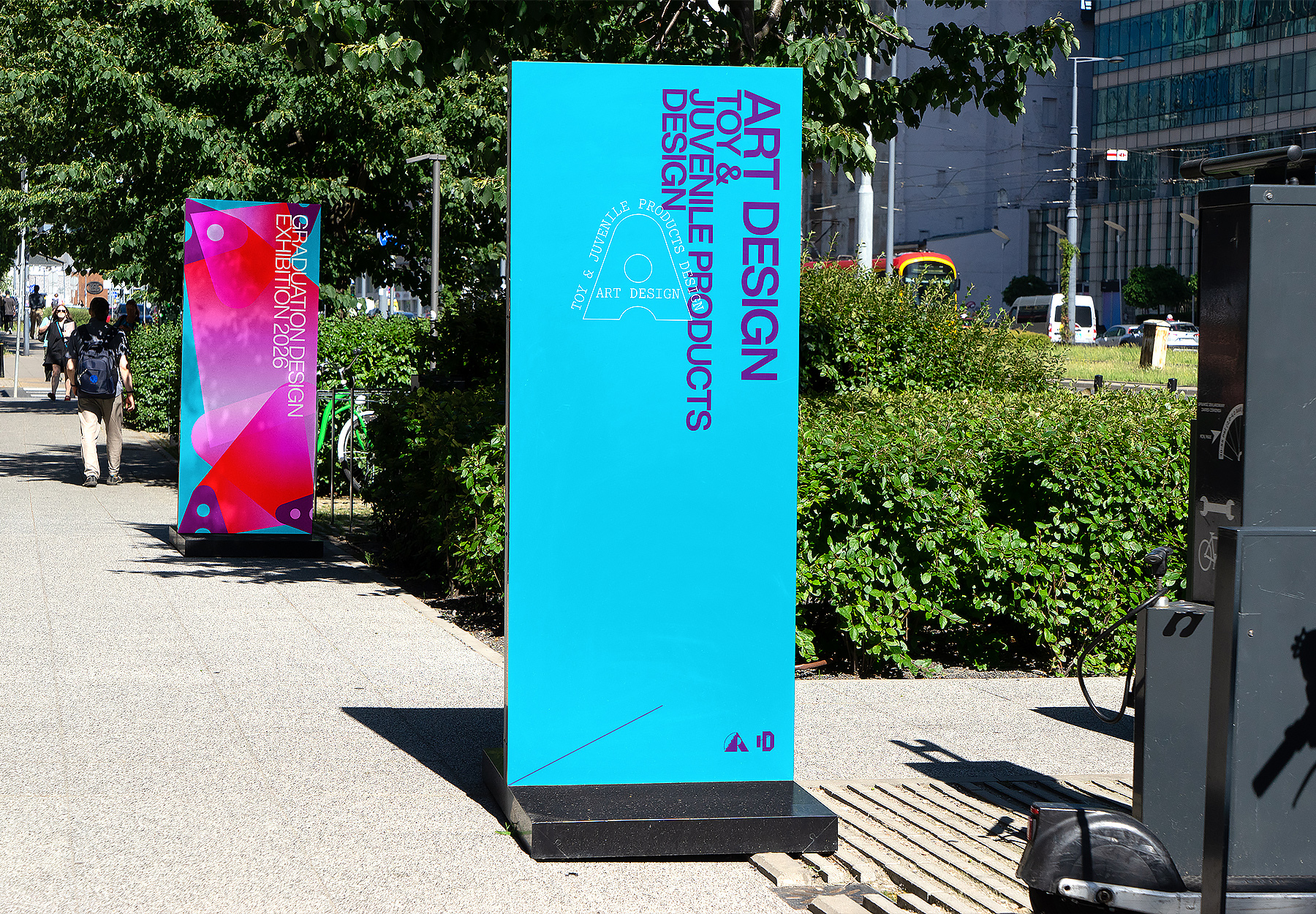 在视觉应用层面,我们将主题字体、色彩系统与专业图形进行有机融合,整体呈现出一种“专业汇报答卷”的概念——既有严谨的内容编排,又不乏跳跃的空间穿插与呼吸感。展板设计进一步强化了这一理念:四个专业的展板依据视觉内容进行分类,每个专业拥有专属的视觉画面、对应的名称及图标,形成清晰的信息层级。在版面规范上,我们限定作品图片比例为16:10,以统一视觉节奏;作品名称、作者信息及指导老师统一排列;作品介绍信息占据版面的0.618(黄金分割比例)宽度,使阅读区域规整而富有秩序;右侧留白区域则给予作者一定的自由发挥空间,可用于添加个人注解、创作手记或额外信息,既满足了规范要求,又保留了表达的个性与温度。