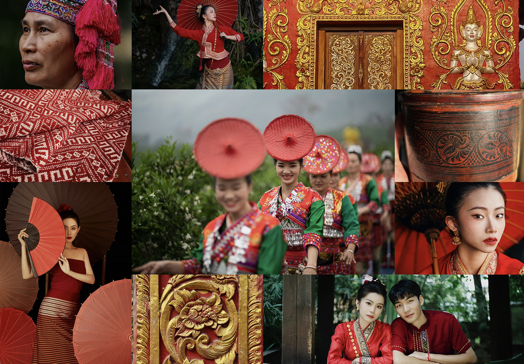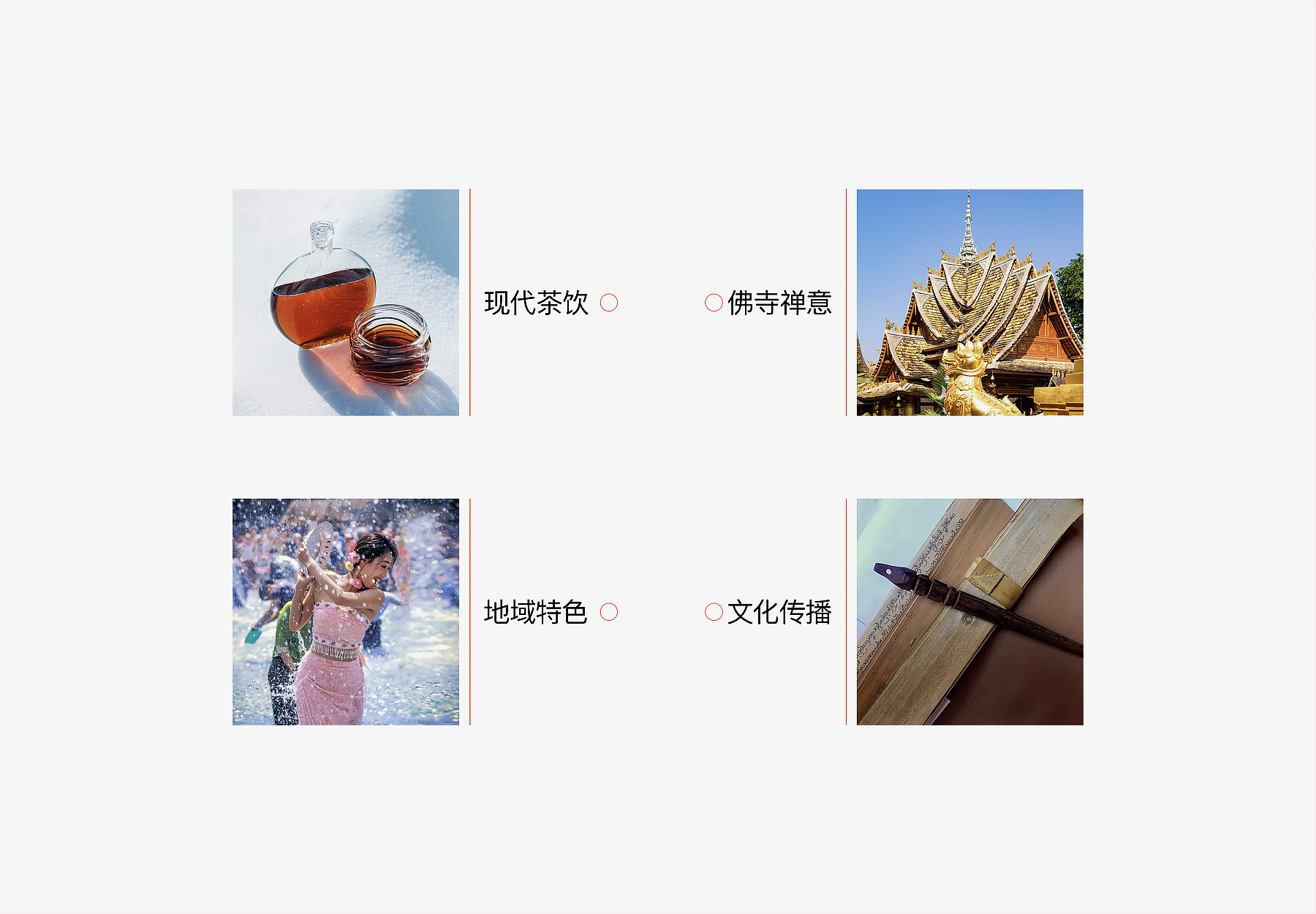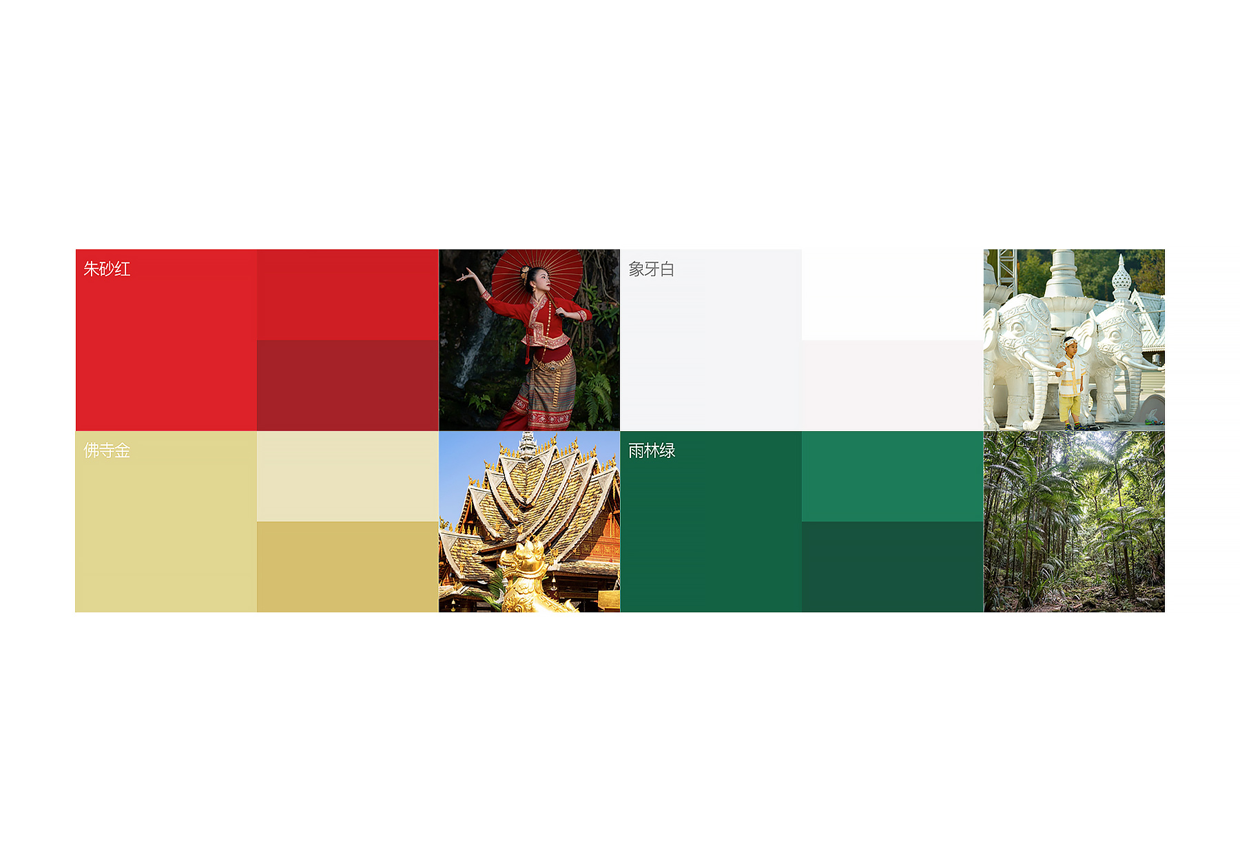 色彩系统的构建首先回应了这一多元诉求:朱砂红象征热情与中式茶文化的厚重;象牙白传递佛寺禅意的纯净与安宁;佛寺金辉映着南传佛教的庄严与温暖;雨林绿则承载着版纳大地的生机与丰饶。四色交织,既对立又和谐,奠定了品牌既神圣又亲切、既传统又现代的视觉基调。