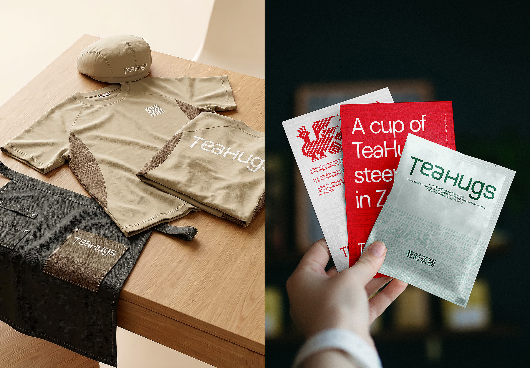 整体而言,“TeaHugs 喜时茶铺”的品牌设计是一次对地域文化的深度解构与当代表达——它尊重传统的信仰与工艺,又以开放的姿态拥抱现代审美,最终呈现出一个既有民族根脉、又具国际时尚感的茶饮品牌形象,成为傣族园中一处可品、可看、可感的文化驿站。