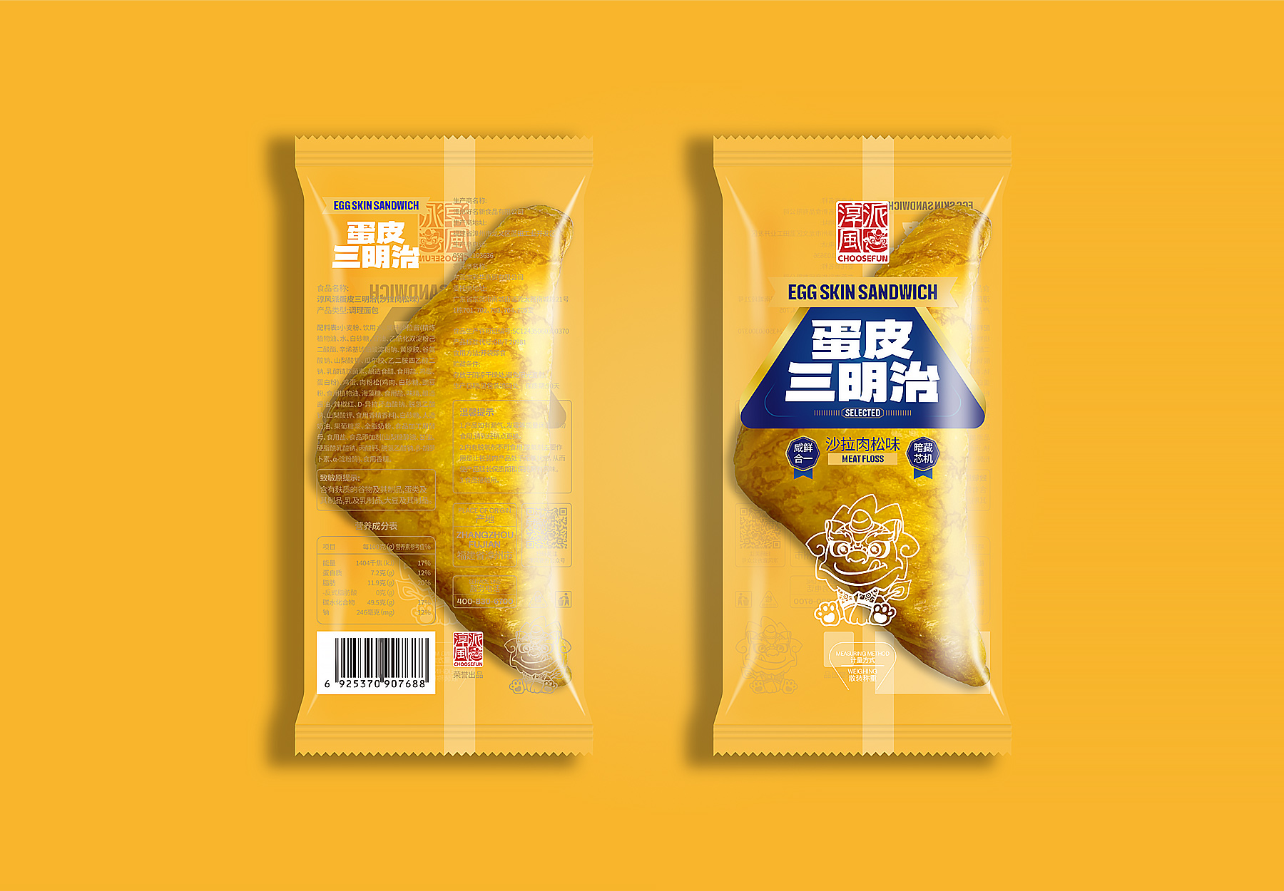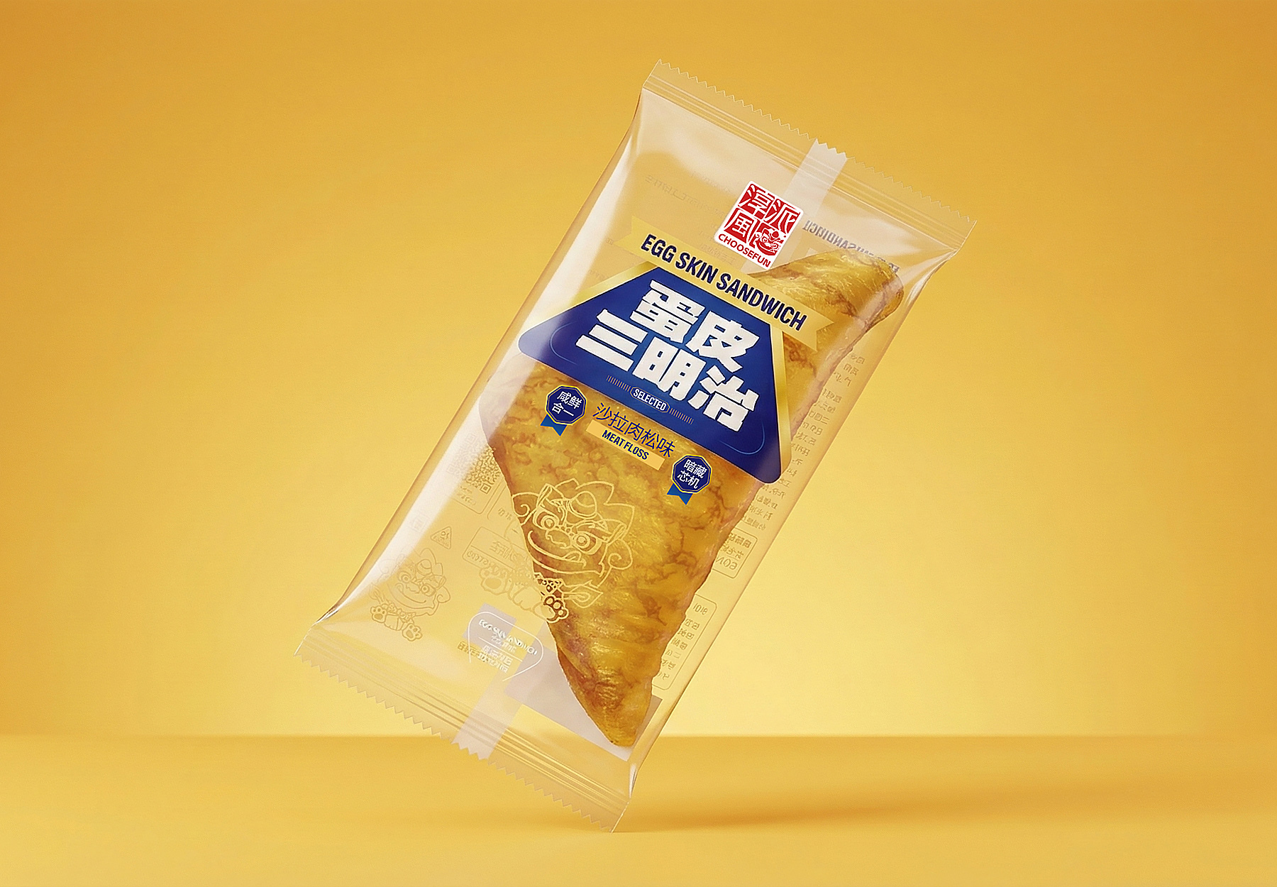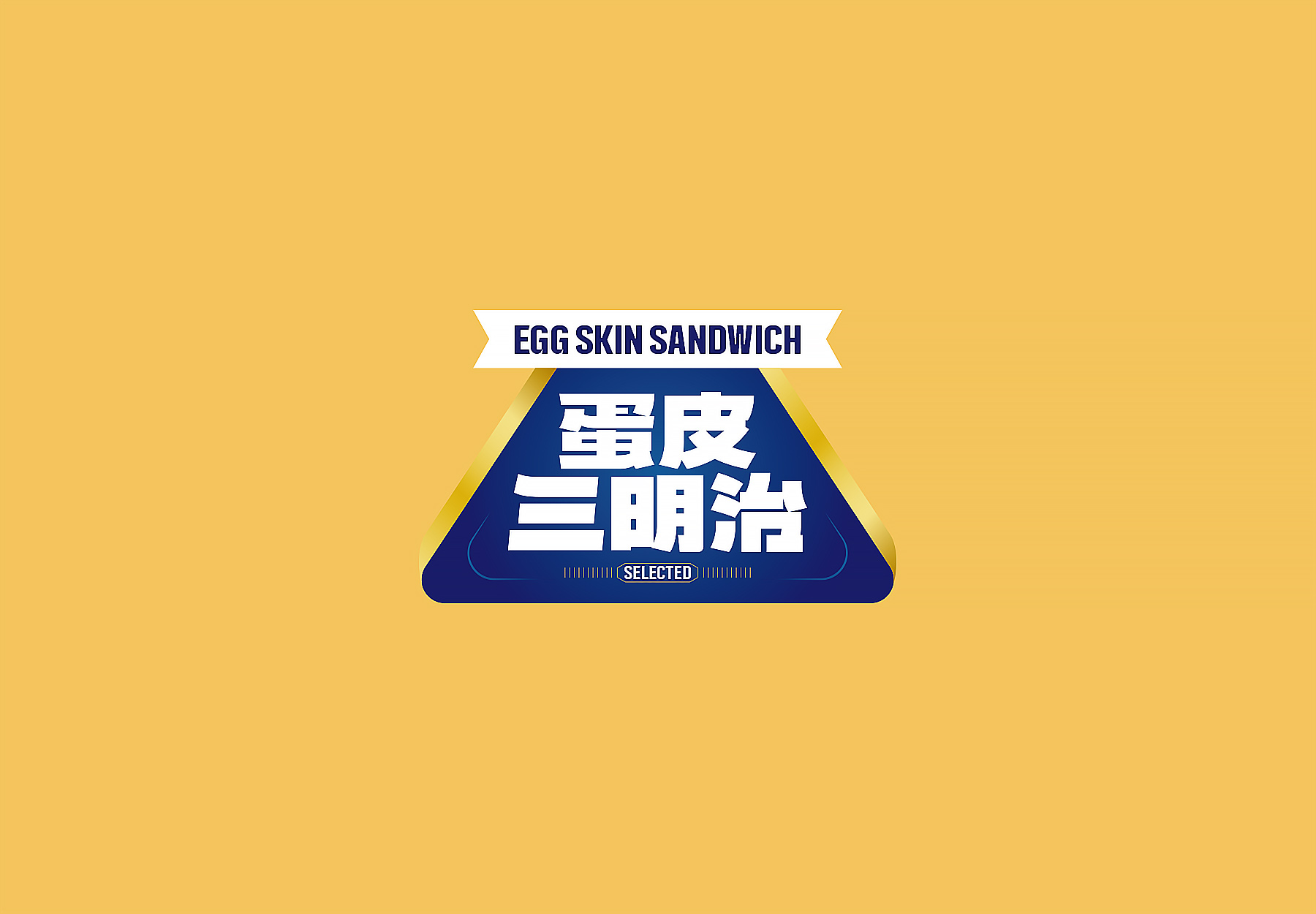 色彩上,选用温暖明亮的“蛋液黄”作为主色,直观传递产品原料特征与新鲜感;同时搭配对比强烈的深蓝色,在视觉上形成冷暖碰撞,既突出了“蛋”与“三明治”的品类属性,又营造出冷静、可靠、富有现代感的高端气质。这一配色方案在吸引眼球的同时,也提升了整体的品质格调。